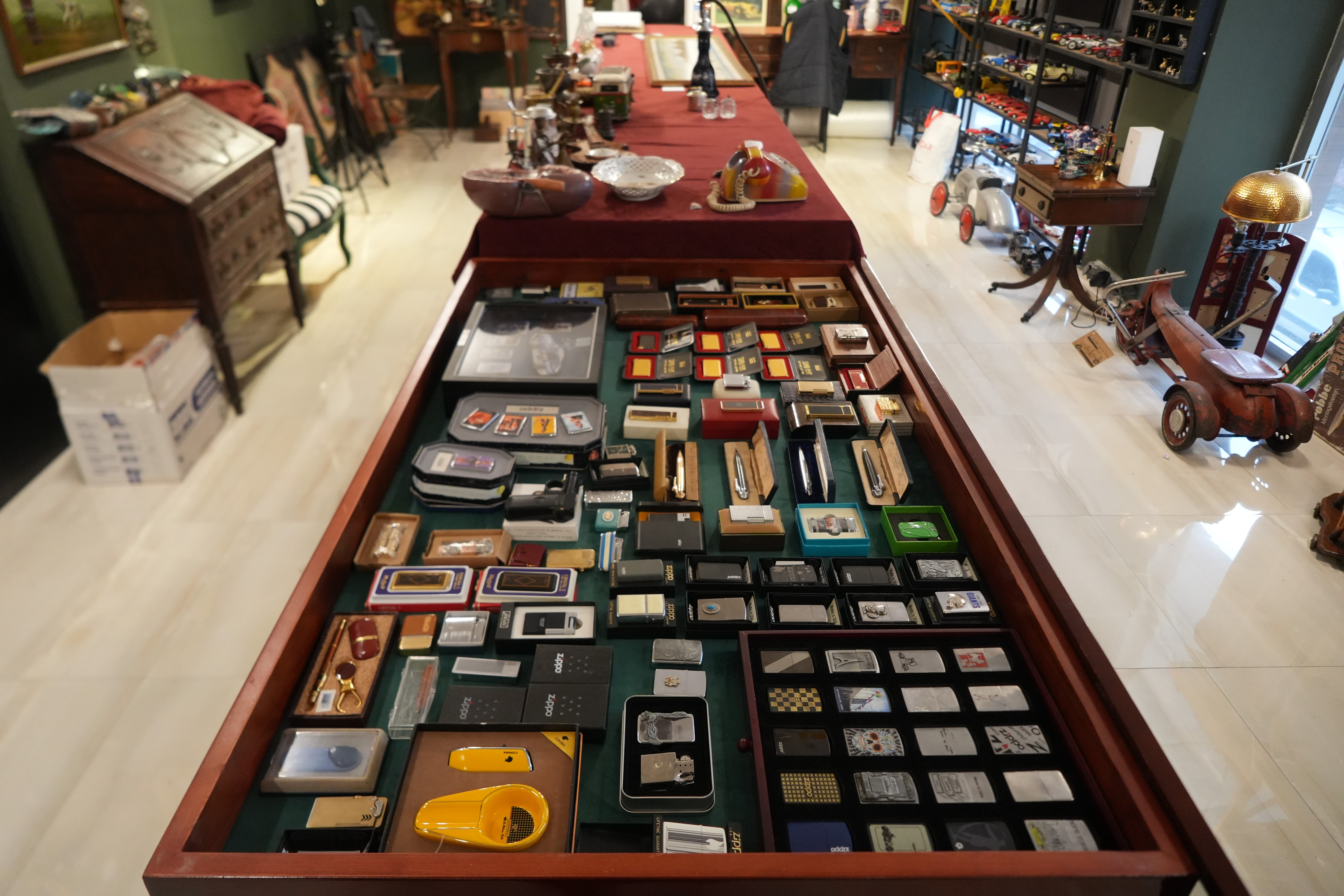 "Fransa, İtalya, Belçika ve Almanya'dan gelen ürünler var. Sanat tarihi açısından bakıldığında 150-200 yıllık biblolarımız da var, 20-30 yıllık olanlar da. Net bir tarih vermek zor, oldukça karışık ve çeşitli. Mesela 200 yıllık biblo da mevcut. Uygun fiyatlı, koleksiyonluk saat bulduğumuzda onları da koleksiyonumuza katıyoruz. Şu an toplamda 10-15 civarında saat var. Şu an ilgi alanım daha çok çakmak olduğu için çakmağa yöneldik ama bu işlerde heves değişebiliyor. Saate ilgi artarsa, o da çoğalabilir. Çakmaklarda genelde Fransa ve İngiltere başrolde. Dupont, Cartier gibi markalar ağırlıklı. Ronson gibi İngiliz markalar da var."