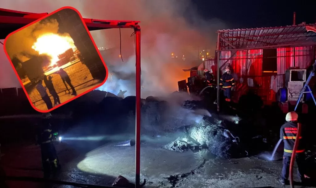 Kocaeli’nin Gebze ilçesinde bulunan bir geri dönüşüm deposunda çıkan yangın, hemen yanındaki palet imalathanesine sıçradı. Kısa sürede büyüyen yangında iki iş yeri de alevlere teslim oldu.