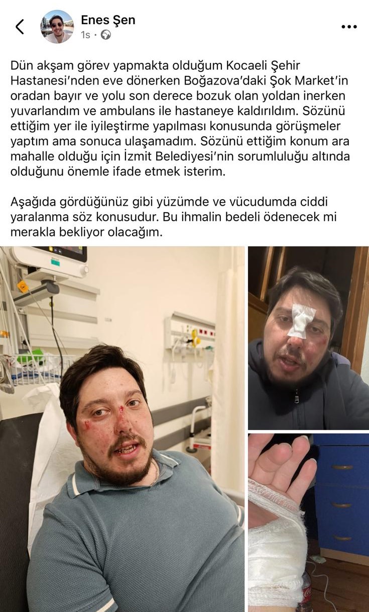 Kocaeli Şehir Hastanesi’nde görev yapan sağlık çalışanı Enes Şen, mesai bitimi evine dönerken belediye sorumluluğundaki bakımsız yol nedeniyle kaza geçirdi. Yüzünde ve vücudunun çeşitli yerlerinde ciddi yaralanmalar meydana gelen Şen, ilgili birimlerin ihmaline tepki gösterdi.